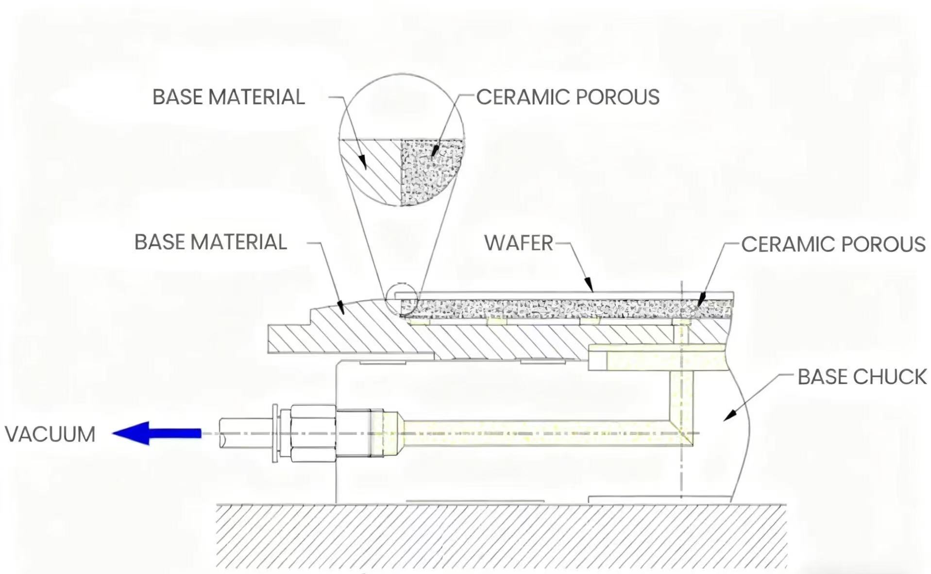 Na -customizePorous ceramic chuckbinubuo ang base at ang porous ceramic plate. Pagkonekta sa isang sistema ng vacuum, ang kapaligiran ng mababang presyon ay nilikha sa pamamagitan ng paglisan ng hangin sa pagitan ng wafer at ng ceramic. Sa ilalim ng negatibong presyon ng vacuum, ang wafer ay matatag na sumunod sa ibabaw ng chuck, na sa huli ay nakamit ang ligtas at matatag na pag -aayos at pagpoposisyon.
