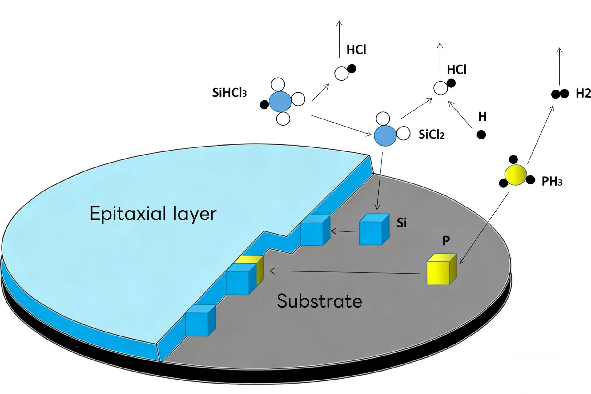 Ang Silicon epitaxy sa pangkalahatan ay gumagamit ng isang singaw phase epitaxy furnace. Ang prinsipyo nito ay ang agnas ng mapagkukunan ng silikon (tulad ng silane, dichlorosilane, trichlorosilane, at silikon tetrachloride ay nag -reaksyon sa hydrogen upang makabuo ng silikon. Sa panahon ng paglaki, ang mga doping gas tulad ng ph₃ at b₂h₆ ay maaaring ipakilala nang sabay -sabay. Ang doping na konsentrasyon ay tiyak na kinokontrol ng gas na bahagyang presyon upang makabuo ng isang epitaxial layer na may isang tiyak na resistensya.