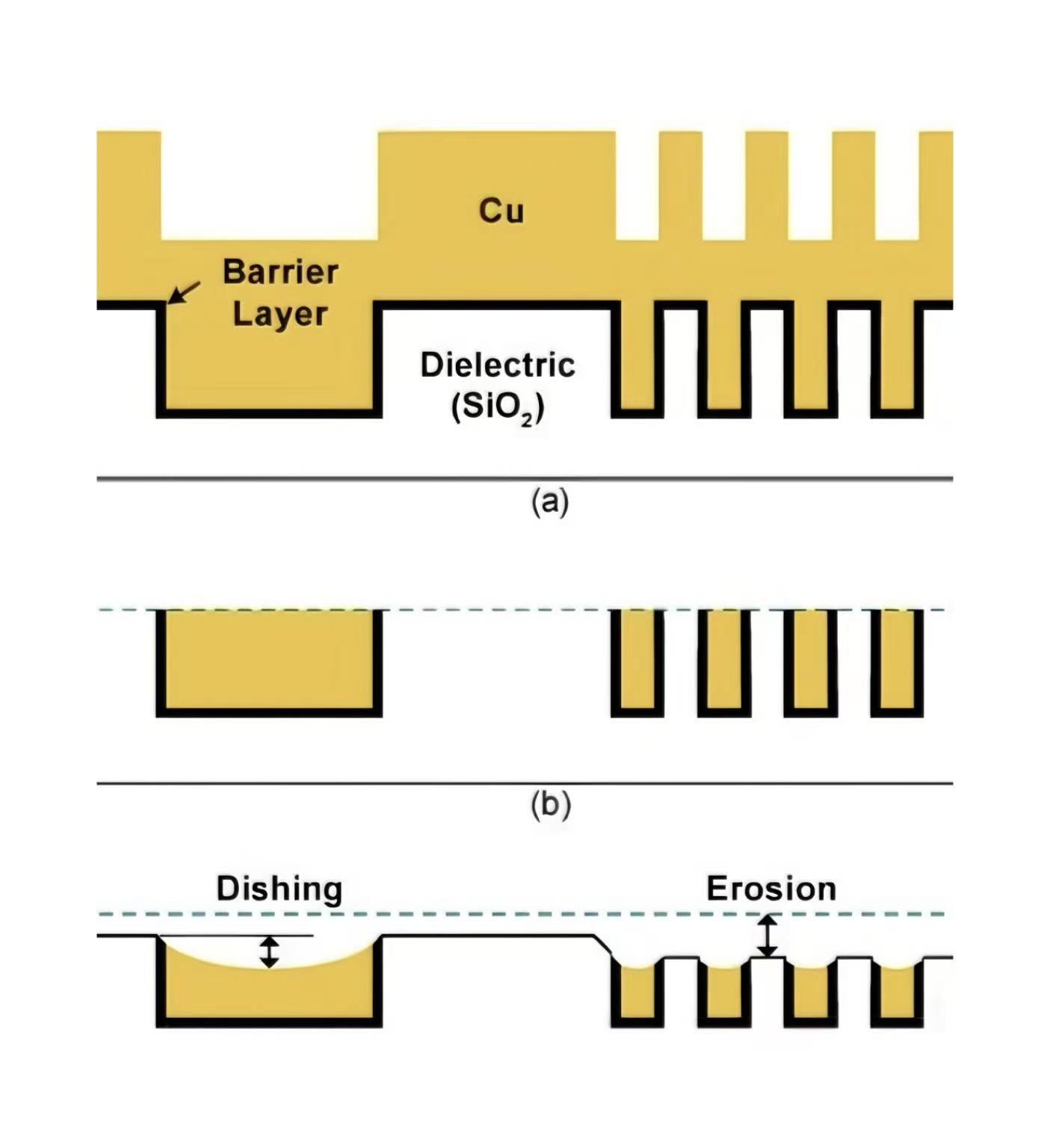 Ang kemikal na mekanikal na buli (CMP), na pinagsasama ang kaagnasan ng kemikal at mekanikal na buli upang alisin ang mga pagkadilim ng ibabaw, ay ang makabuluhang proseso ng semiconductor para sa pagkamit ng pangkalahatang pagpaplano ngwaferibabaw. Ang mga resulta ng CMP sa dalawang mga depekto sa ibabaw, dishing at pagguho, na makabuluhang nakakaapekto sa flatness at de -koryenteng pagganap ng mga istrukturang magkakaugnay.