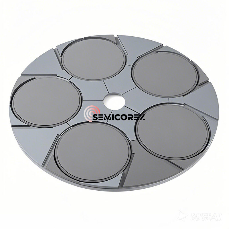 Pangunahing ginagamit sa proseso ng metal na organikong kemikal na pag -aalis ng singaw (MOCVD), ang satellite plate ay mahalaga para sa lumalagong mga layer ng epitaxial sa mga semiconductor wafers. Ito ay gumaganap ng isang pangunahing papel sa paggawa ng mga advanced na aparato ng semiconductor, kabilang ang mga LED, SIC at GaN-based na electronics ng power, photonic at optoelectronic na mga sangkap, at mga high-frequency na aparato ng RF. Sa pamamagitan ng pagtiyak ng matatag na mga kondisyon ng thermal at pag -minimize ng kontaminasyon, ginagarantiyahan ng satellite plate ang pare -pareho na paglaki ng epitaxial layer, na humahantong sa pinahusay na paghawak ng wafer at mas mataas na mga rate ng ani. Ang na -optimize na disenyo nito ay nagsisiguro ng suporta ng wafer nang mahusay, binabawasan ang mga depekto at tinitiyak ang katumpakan sa buong yugto ng pagproseso ng semiconductor.