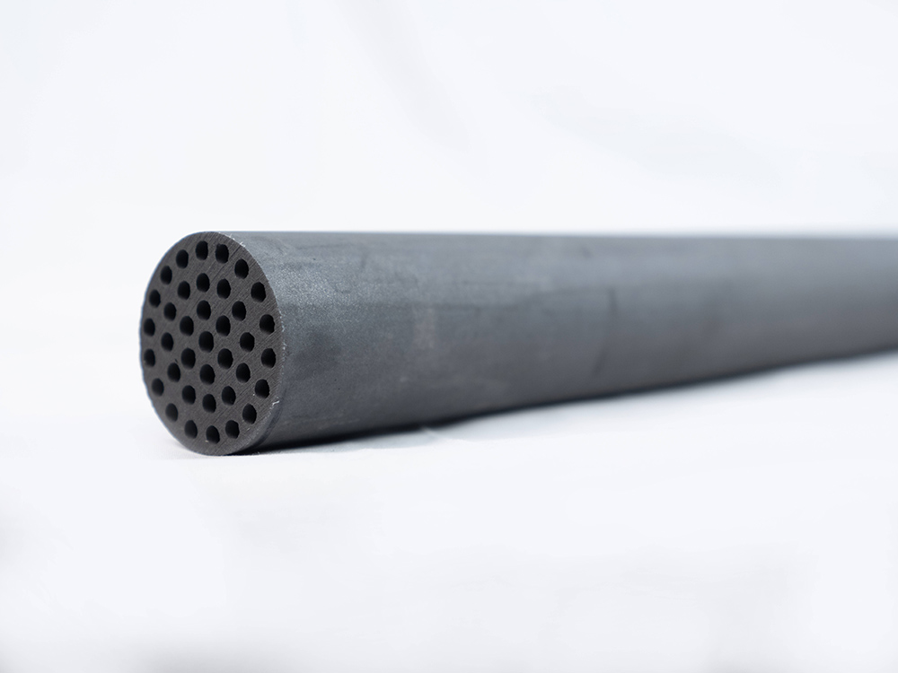 Ang lamad ng silikon na karbida ay dinisenyo gamit ang isang multichannel tubular na istraktura na nagpapatakbo gamit ang isang paraan ng pagsasala ng cross-flow. Ang disenyo na ito ay nagpapabuti sa proseso ng paghihiwalay, kung saan ang likidong feed ay mabilis na dumadaloy sa loob ng mga lamad ng lamad. Sa ilalim ng presyon, ang permeate na naglalaman ng maliit na mga sangkap ng molekular ay dumadaan sa lamad sa isang direksyon na patayo sa daloy, habang ang retentate, na naglalaman ng mas malaking molekula, ay mananatili. Ang natatanging pagsasaayos ng cross-flow na ito ay makabuluhang binabawasan ang fouling at clogging, dahil ang ibabaw ng lamad ay patuloy na nalinis ng dumadaloy na likido. Bilang isang resulta, ang system ay maaaring tumakbo nang mahusay para sa mga pinalawig na panahon, pagpapanatili ng mataas na pagganap nang walang makabuluhang mga pagkagambala sa pagpapanatili.